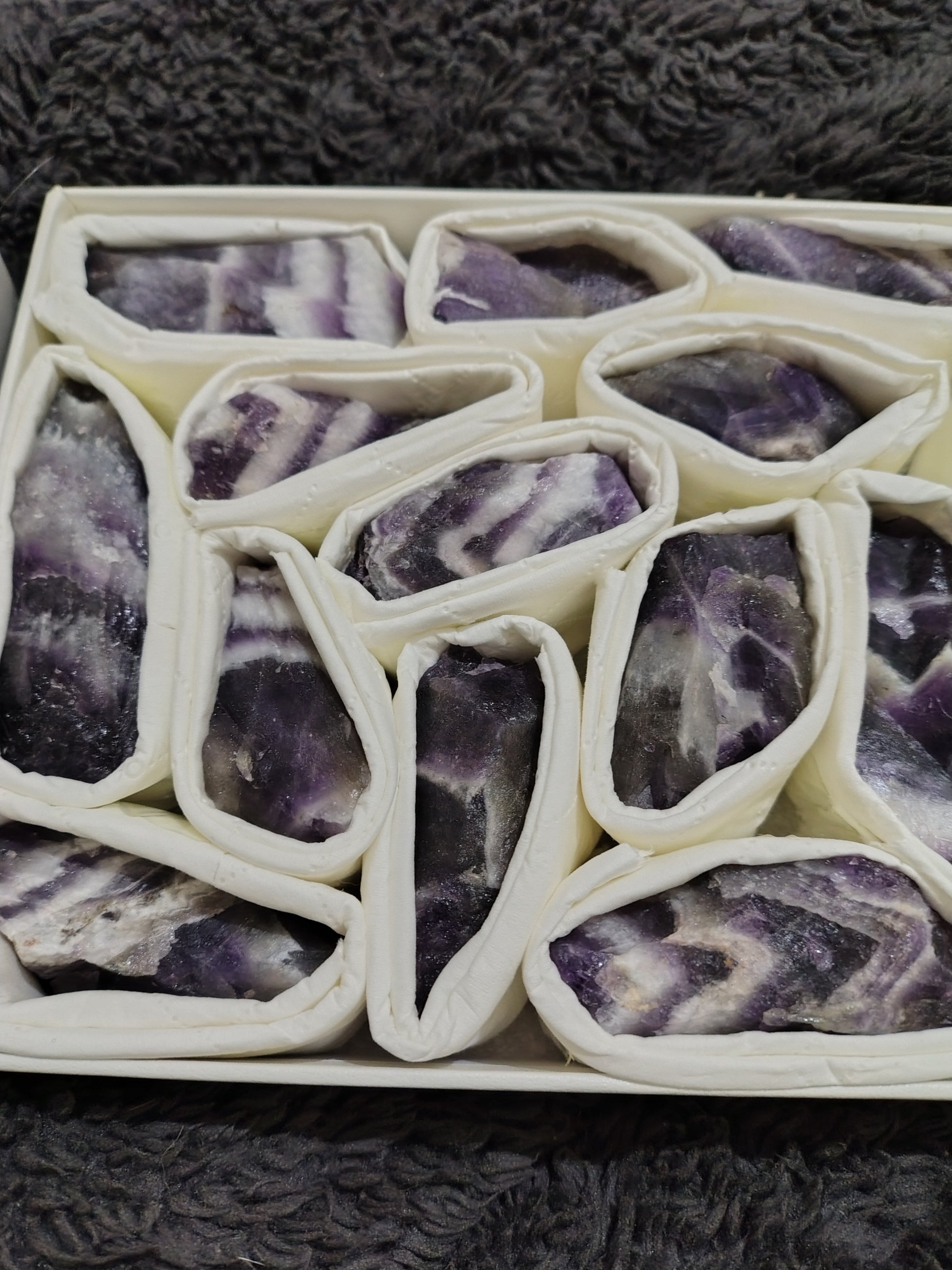 Also known as Chevron Amethyst, this striking crystal combines the calming energy of amethyst with powerful white quartz banding. Its natural raw form radiates soothing vibrations, making it perfect for meditation, restful sleep, and spiritual growth.